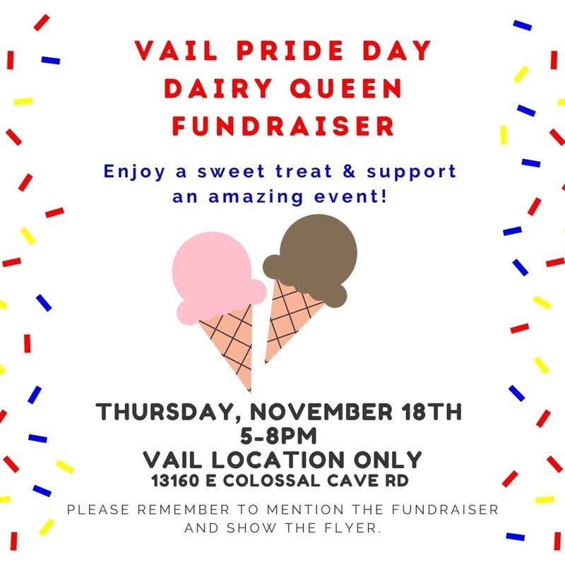 Just in case you needed an "excuse" to go get some Dairy Queen, we've got a great one! Join us for a Vail Pride Day Fundraiser on Thursday, November 18th from 5-8 p.m. at the Vail DQ.